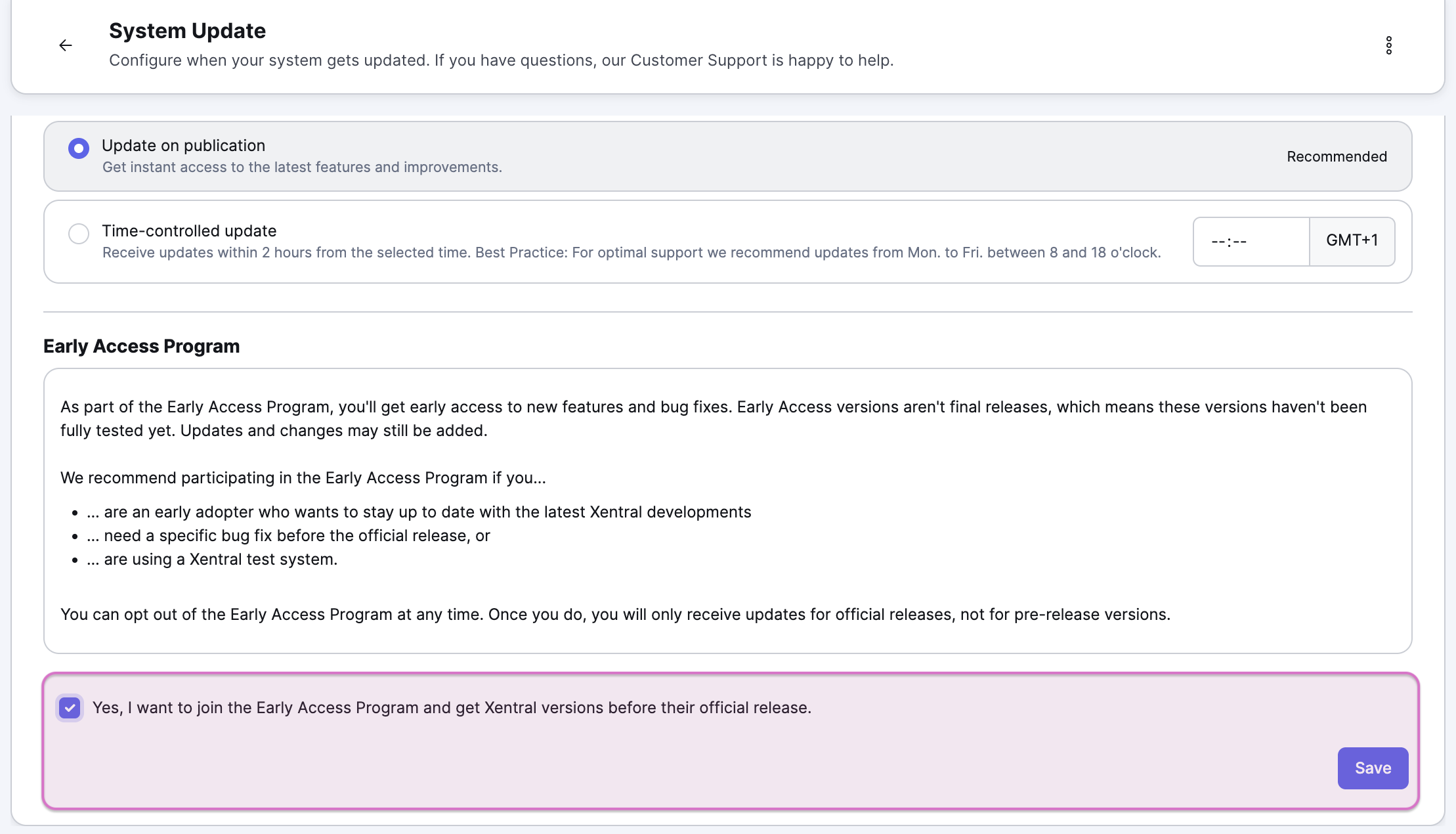 Activate the option Yes, I want to join the Early Access Program and get Xentral versions before their official release.