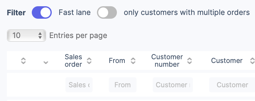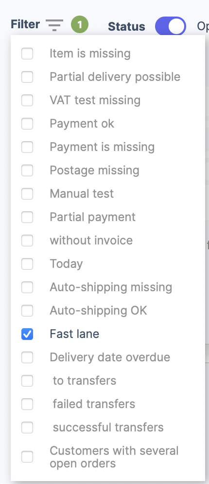 You can set the fast lane flag in your sales orders manually or automatically in Xentral . These flags can then be used in certain filter functions to display the sales orders which have priority.