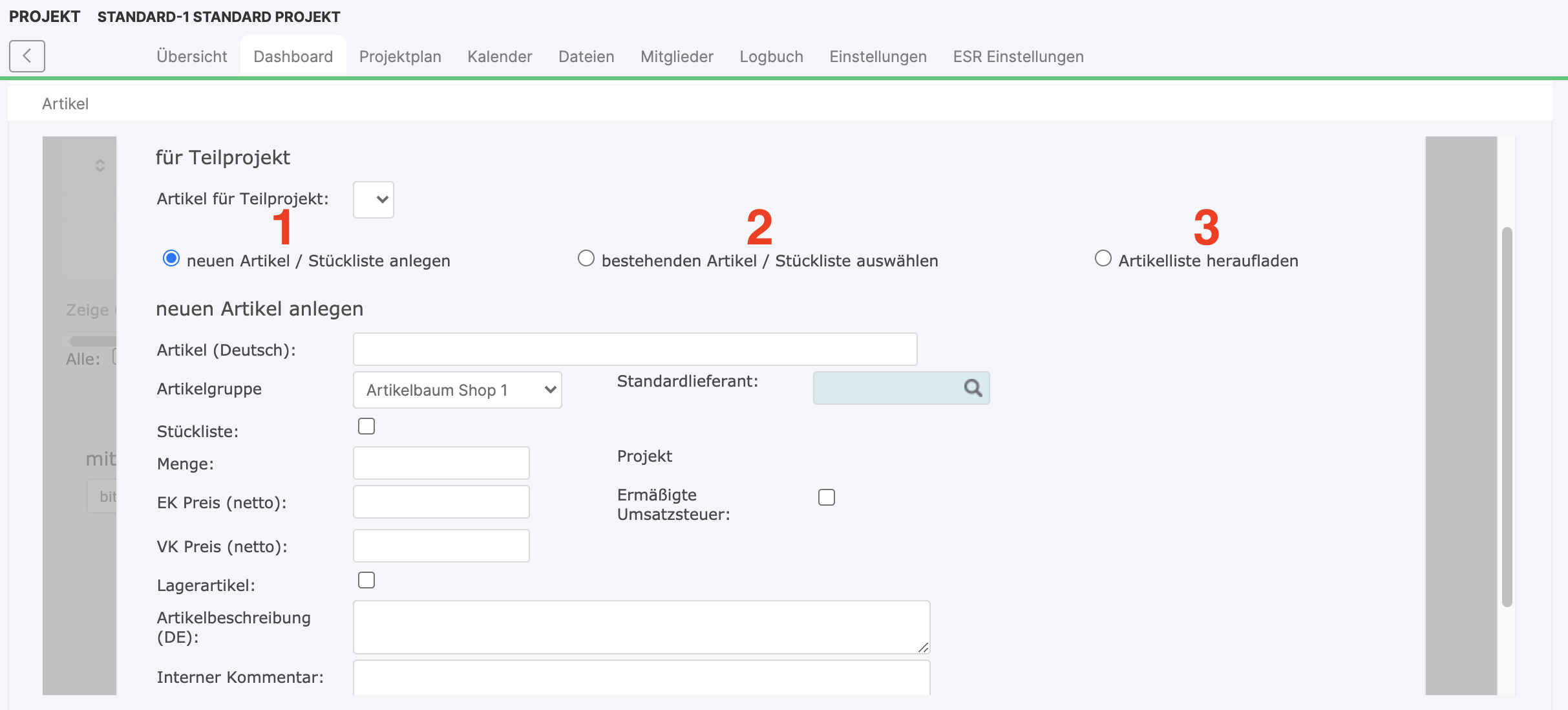First of all, the sub-project to which the articles are to be added is selected. Then select the way in which the articles are to be added: