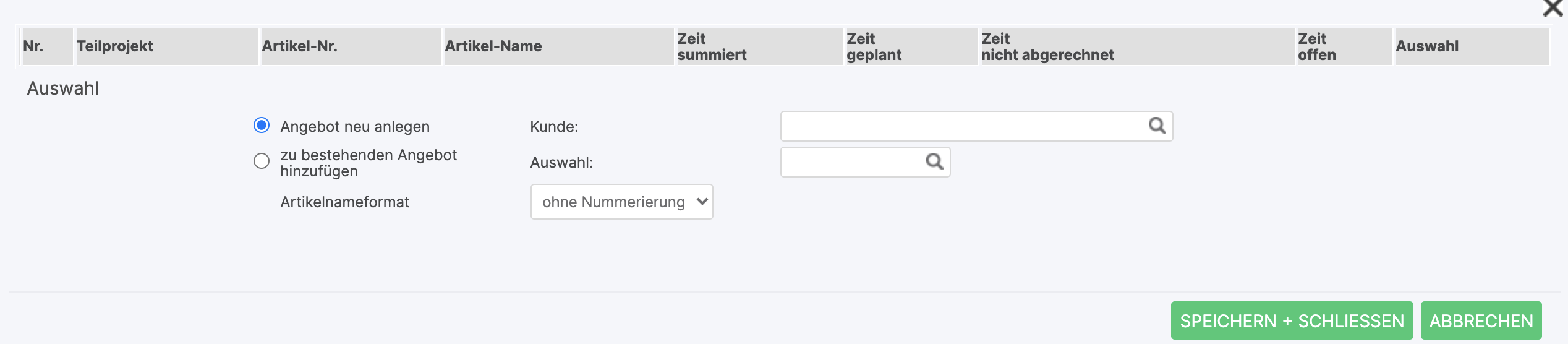 At the bottom left there is a question about the product format, where by means of a dropdown either the numbering of the project can be transferred to the receipts or this can be excluded. If no hourly rate article has yet been specified, this can be done at this point; In this case, it should be noted that the hourly rate given refers to all sub-projects to which no hourly rate has yet been assigned. If this is a sub-project that is based on further sub-projects, the sub-project can be billed and the associated sub-projects can optionally be displayed as descriptive texts. Alternatively, the sub-projects can also appear as independent positions by selecting the option including all sub-projects as a separate position. The planned times can also appear as a position, whereby the corresponding setting can be used to differentiate between the designations of the billing article and those of the sub-project.