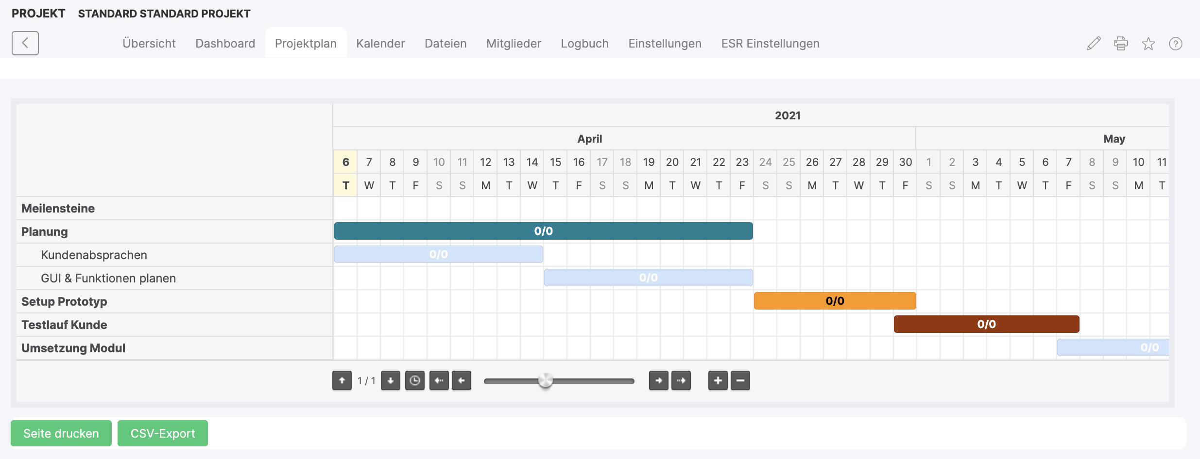 Click on the GANTT bar to open a dialog in which the main settings of the sub-project can be made. Milestones of projects can be created, named and marked with a color in the project calendar (or in the main calendar of the system). The content of a GANTT diagram can be printed out or exported as a CSV file: