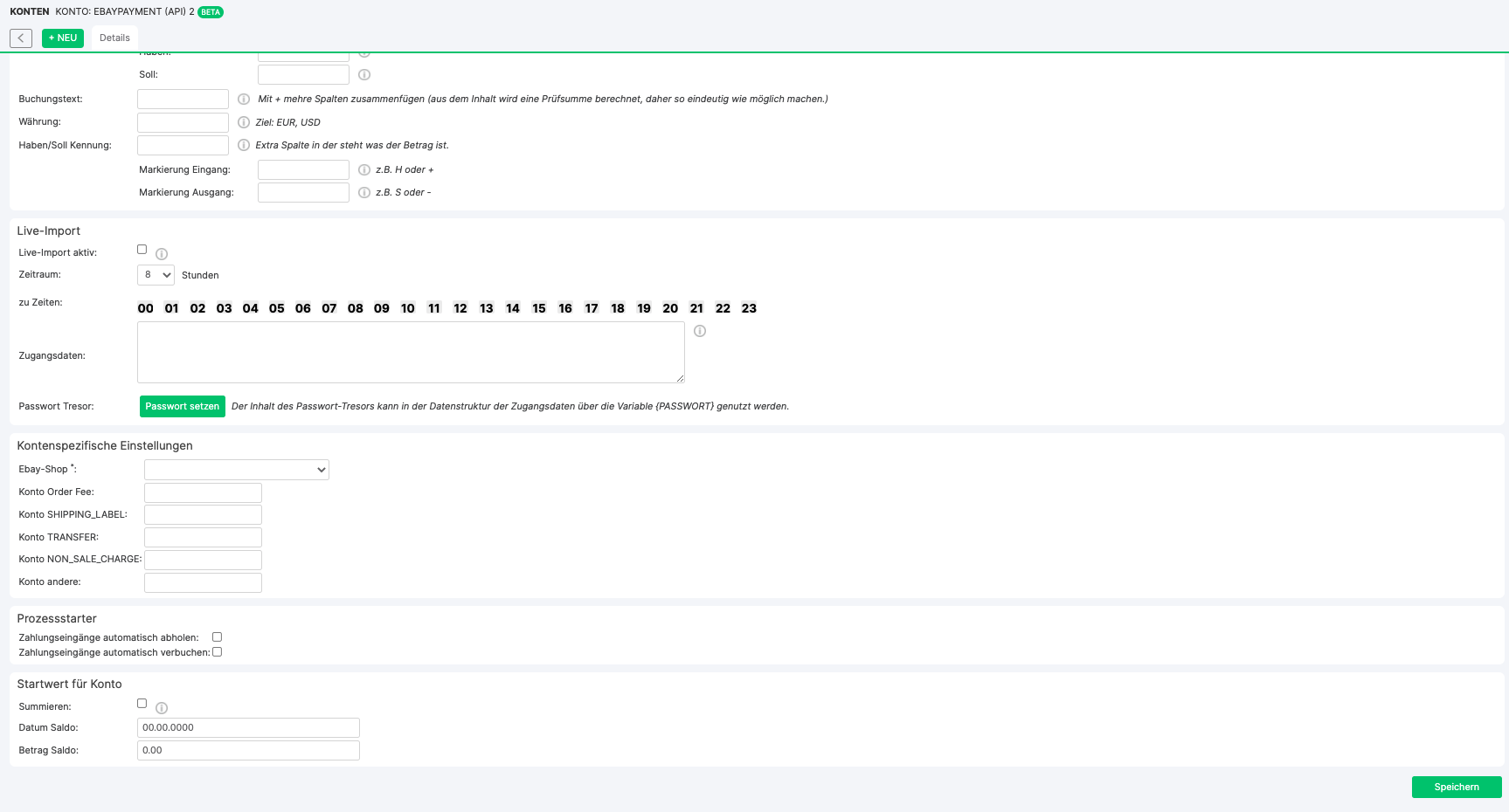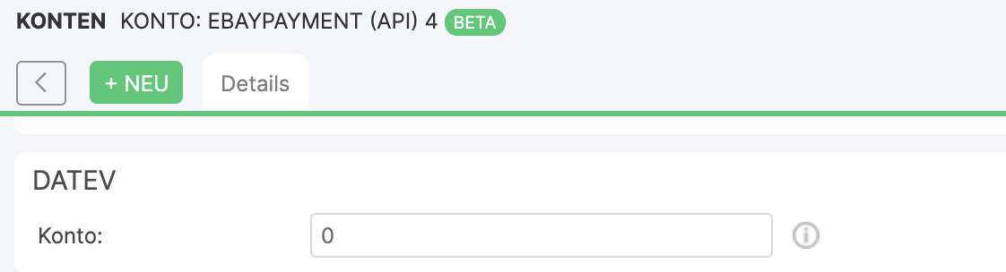 Via the button +NEW in the account overview you can create a new eBayPayment account. If you have already created an account in Xentral, you can edit it by clicking the Edit button.