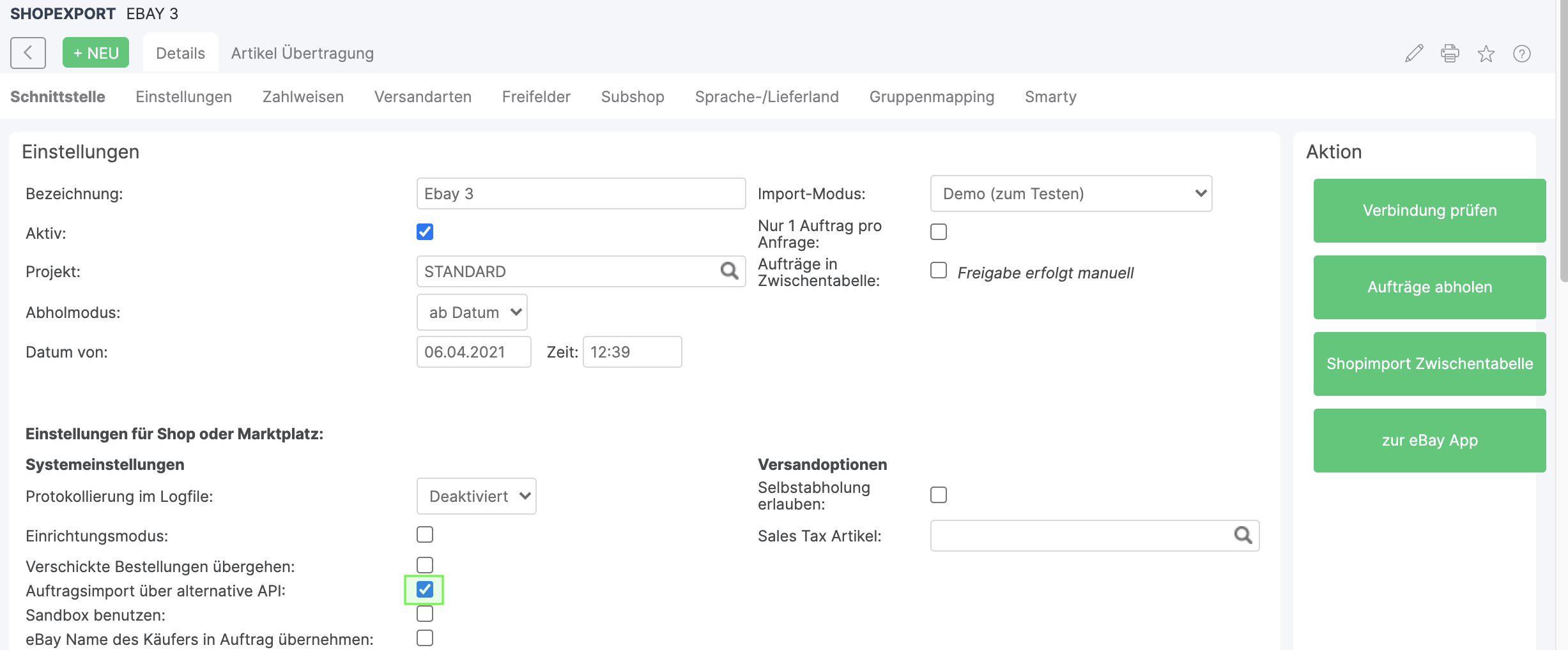 To use eBay Payments, it is important that Order import via the alternative API is selected in the settings of the connected eBay account (Administration → Settings → Shop interface → select eBay). → Settings → Shop Interface → select eBay).