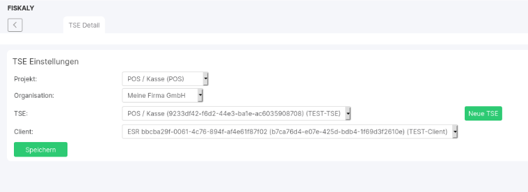 Now enter the Xentral project/ POS for which you want to create the TSE, as well as the organization/location of the POS (the organizations created in the previous step). Leave the lower two fields empty, they will be filled automatically in the next step. Click on New TSE and confirm the creation in the following window.