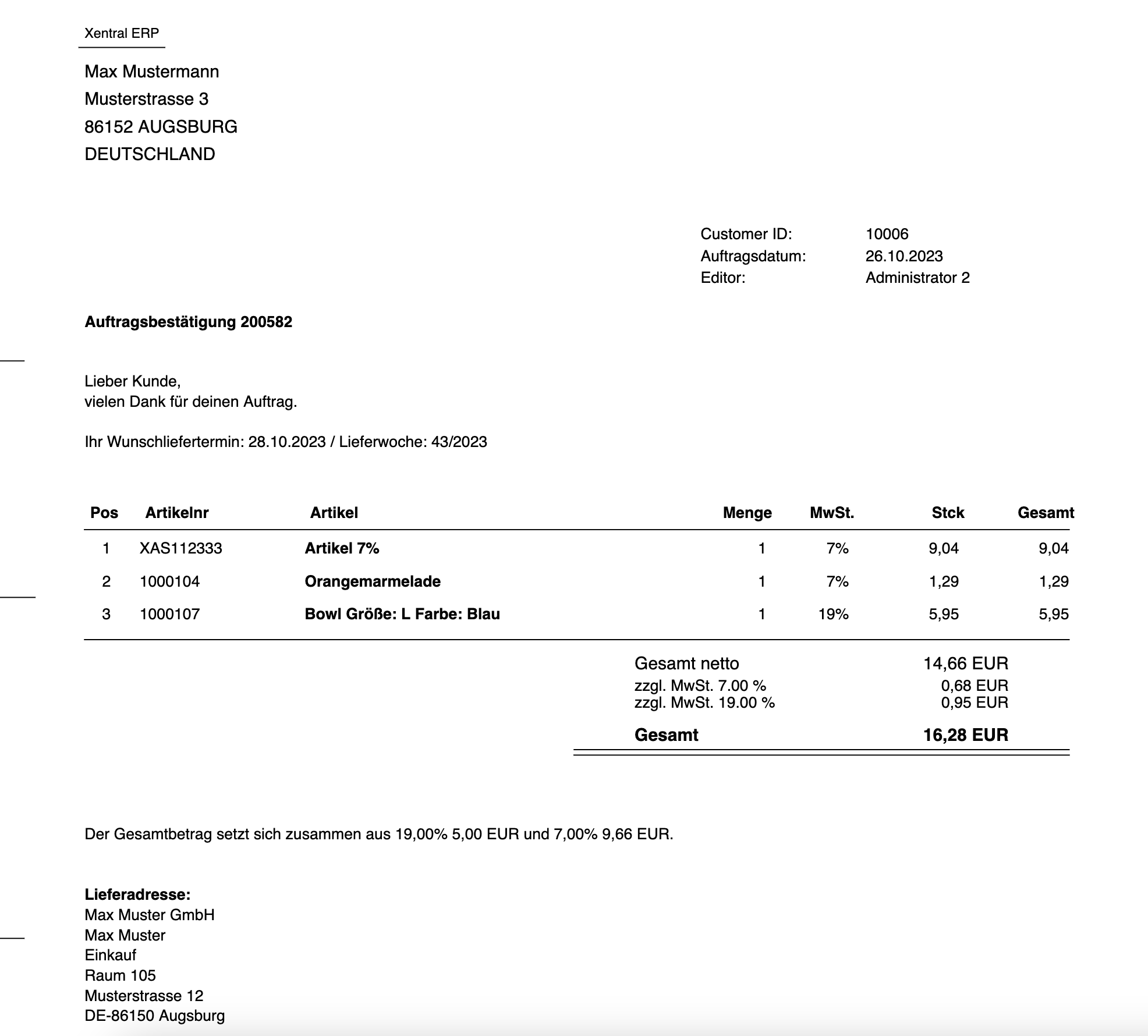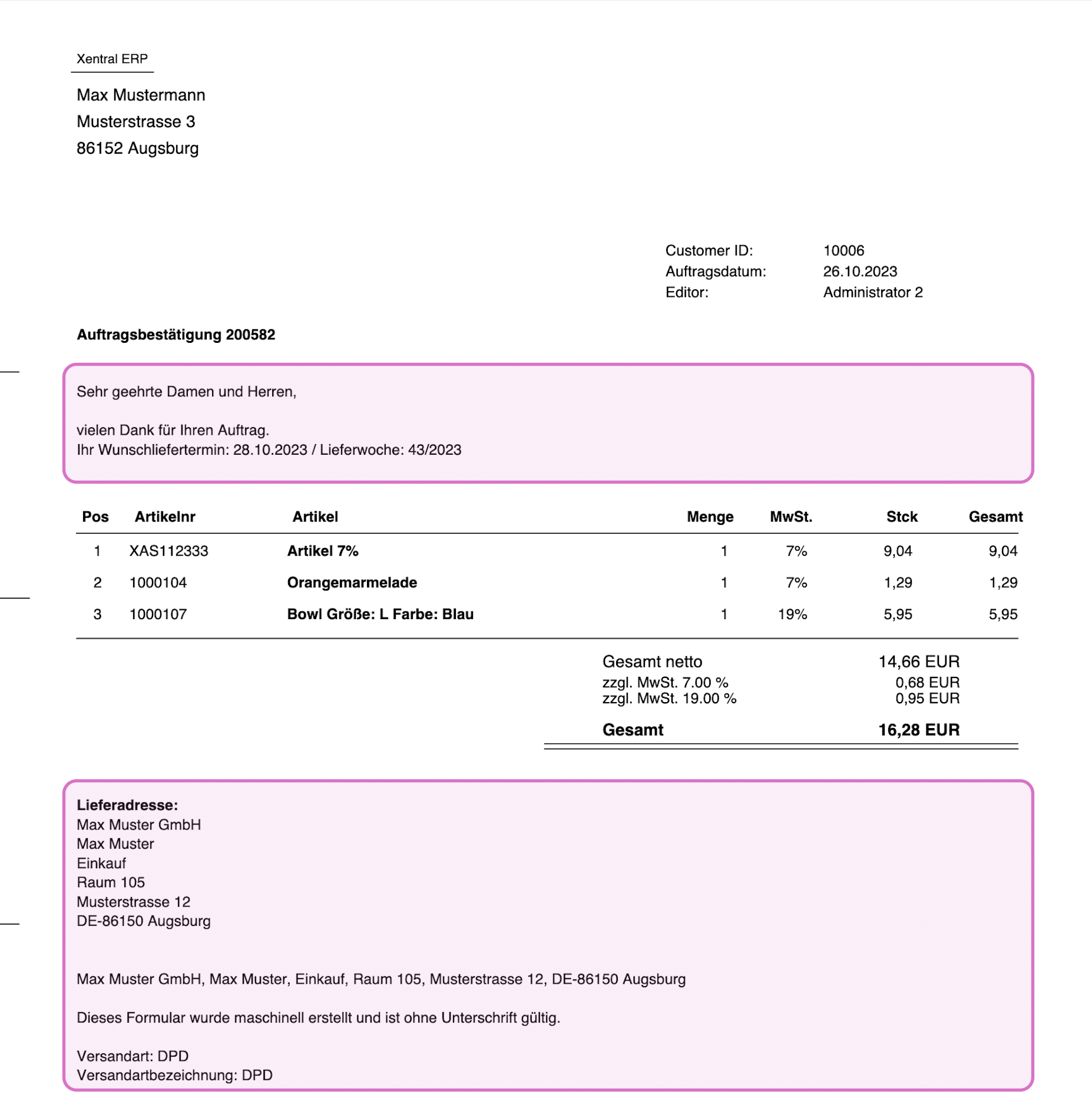 Die Textbausteine und Variablen werden vor und nach der Artikeltabelle auf dem Beleg angezeigt.
