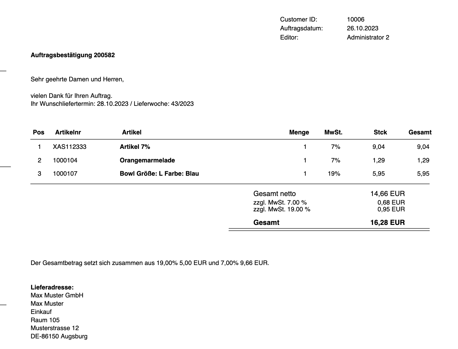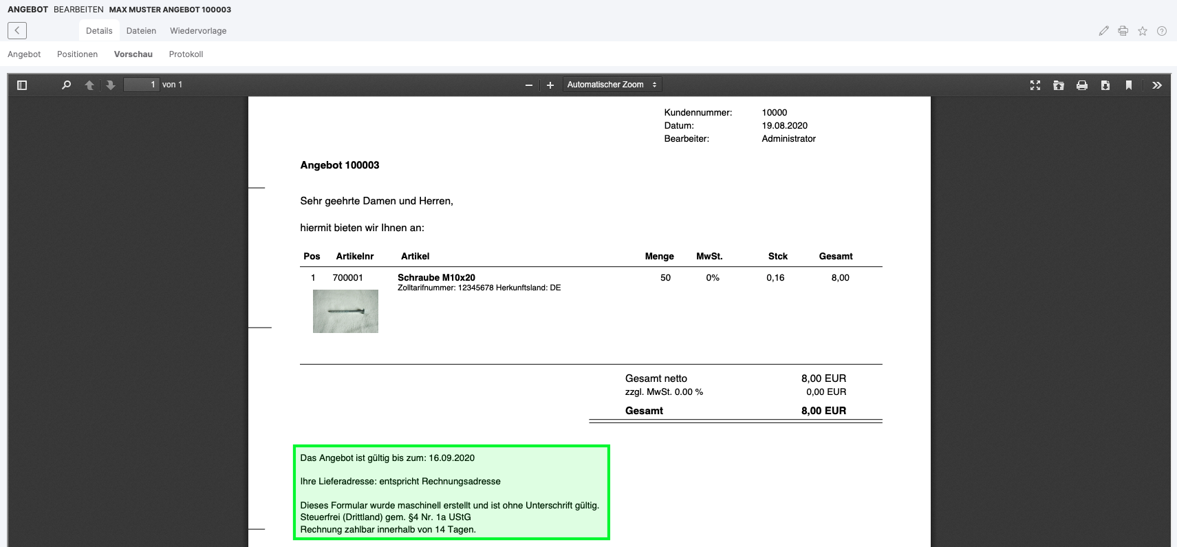 Ergebnis: Der Text wird auf jedem neuen Auftrag vor der Artikeltabelle abgedruckt.