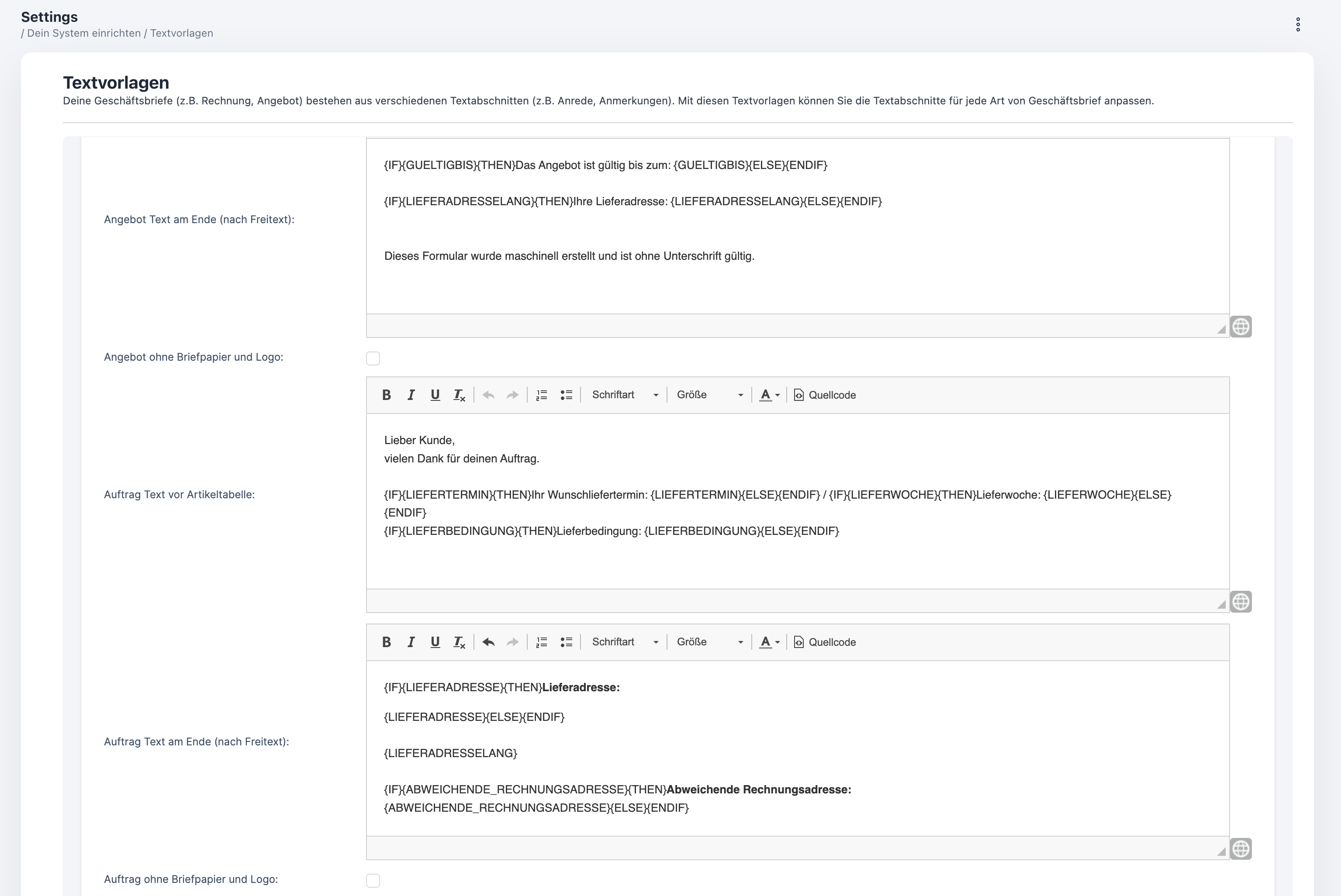 In den Textvorlagen kannst du Textbausteine und Inhalte für Belege festlegen Je Belegart kannst du die Textbausteine oder Inhalte auf Dokumenten abdrucken lassen. Beim Erstellen eines neuen Belegs werden diese Informationen automatisch abgedruckt.