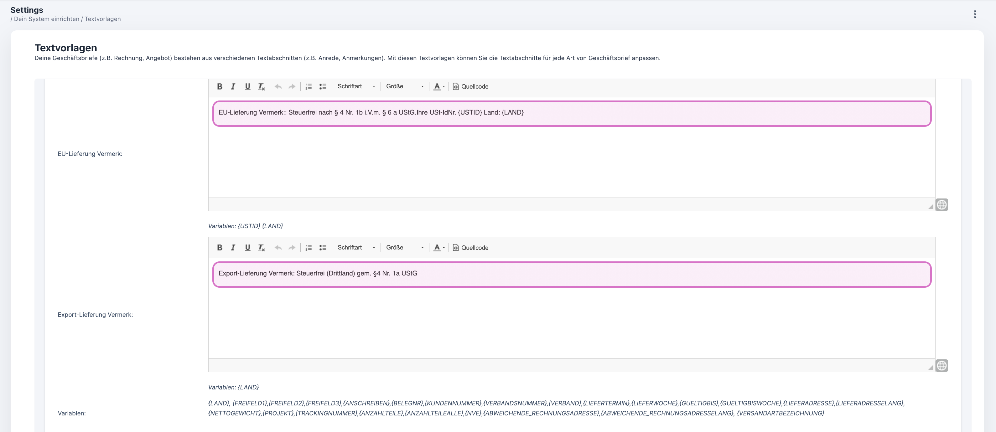 Den Standardtext für EU-Lieferung (Innergemeinschaftliche Lieferung) und Export (Drittland) gibst du in die entsprechenden Felder ein.