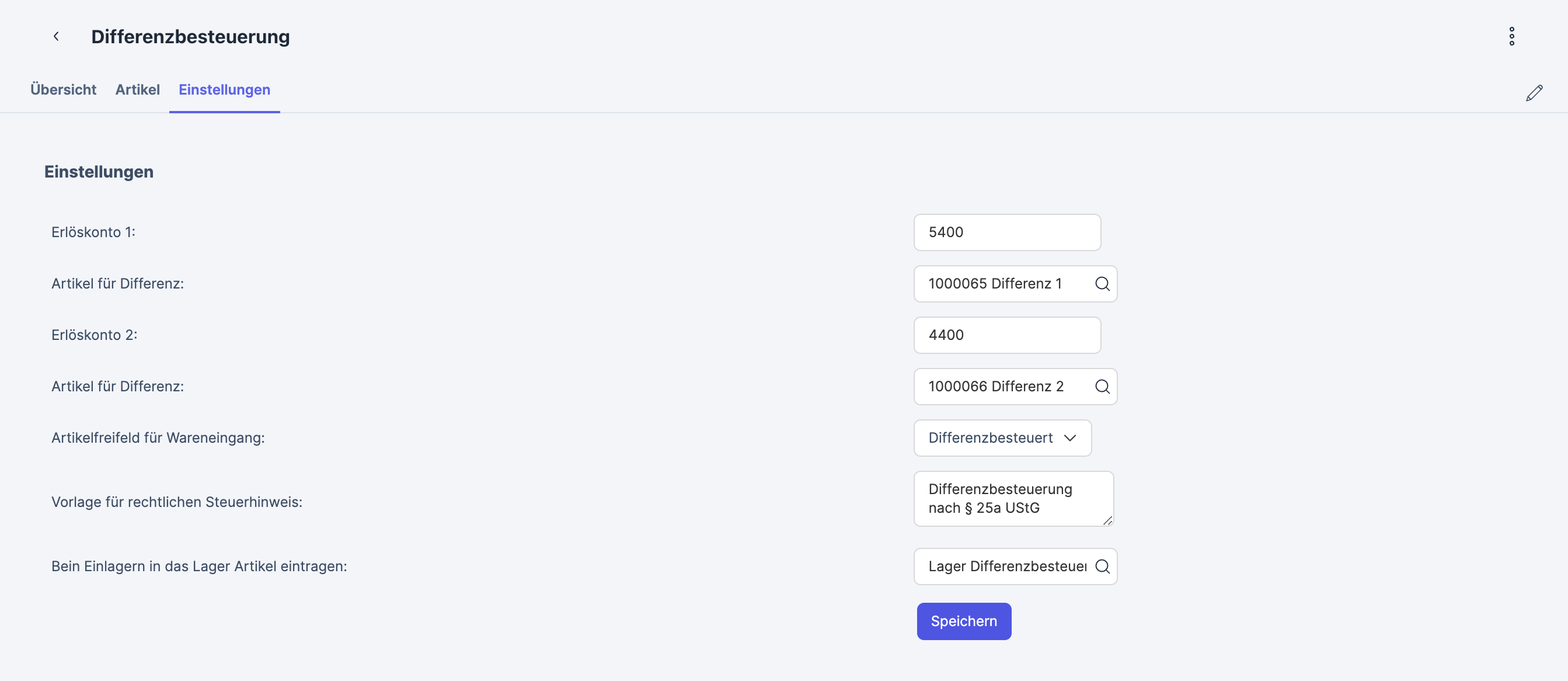 Gehe zurück in die Einstellungen für ‘Differenzbesteuerung’ und wähle bei ‘Beim Einlagern in das Lager Artikel eintragen’ im Dropdown dieses Lager aus.