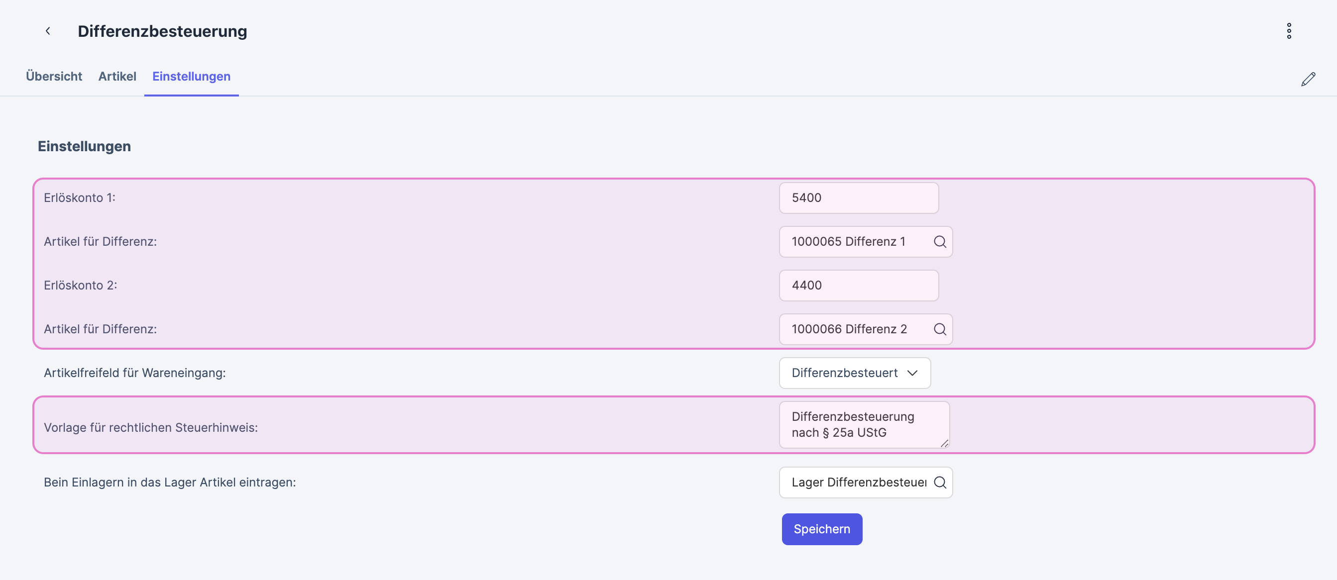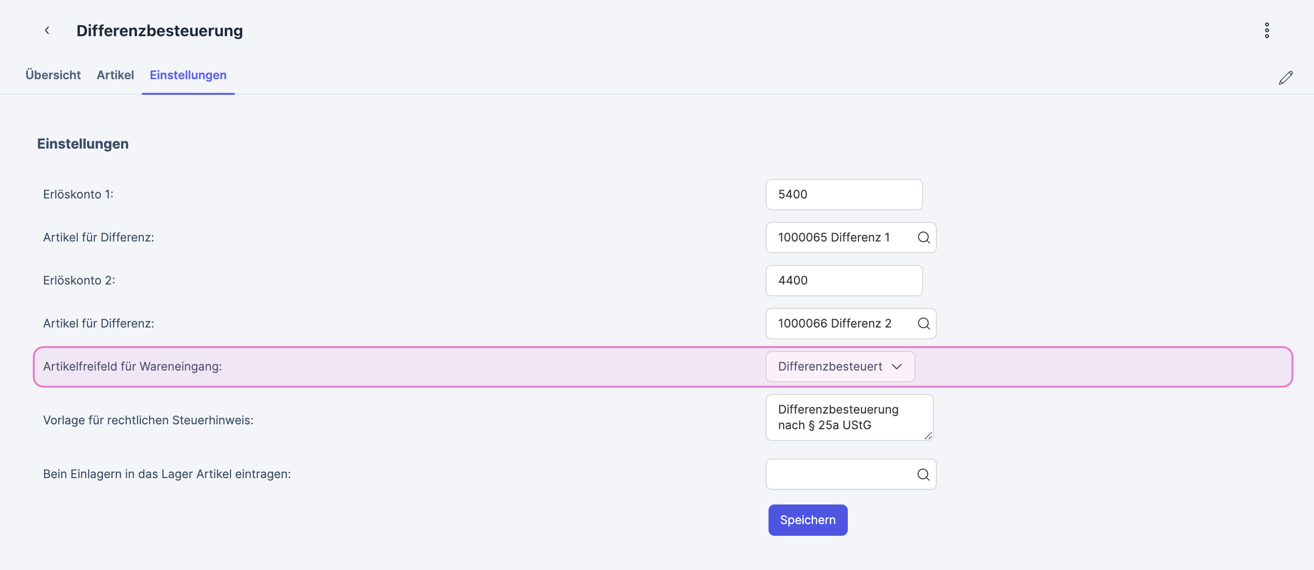 Gehe zurück in die Einstellungen für ‘Differenzbesteuerung’ und wähle bei ‘Artikelfreifeld für Wareneingang’ im Dropdown dieses Freifeld aus.