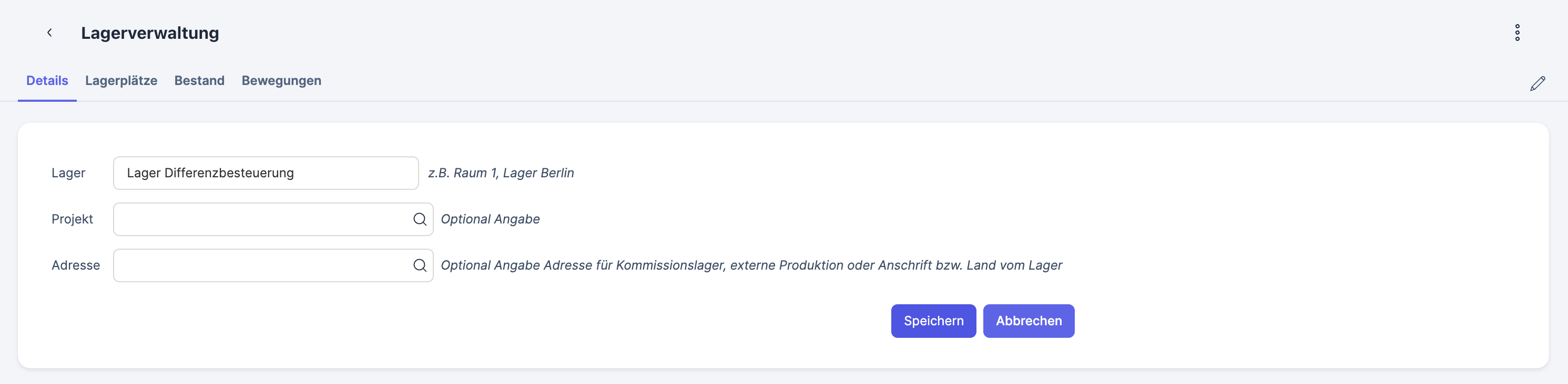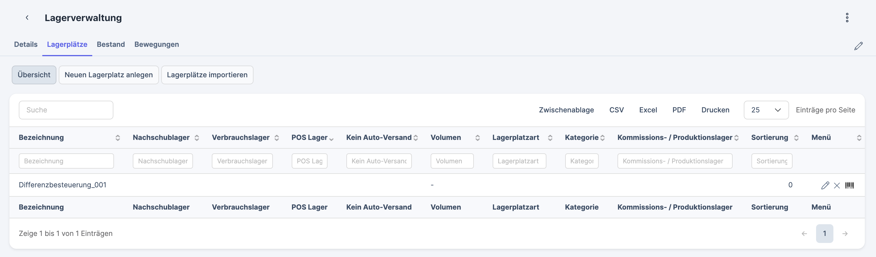 Lege einen neuen Lagerort in der Lagerverwaltung an und nenne diesen z.B. ‘Lager Differenzbesteuerung’.