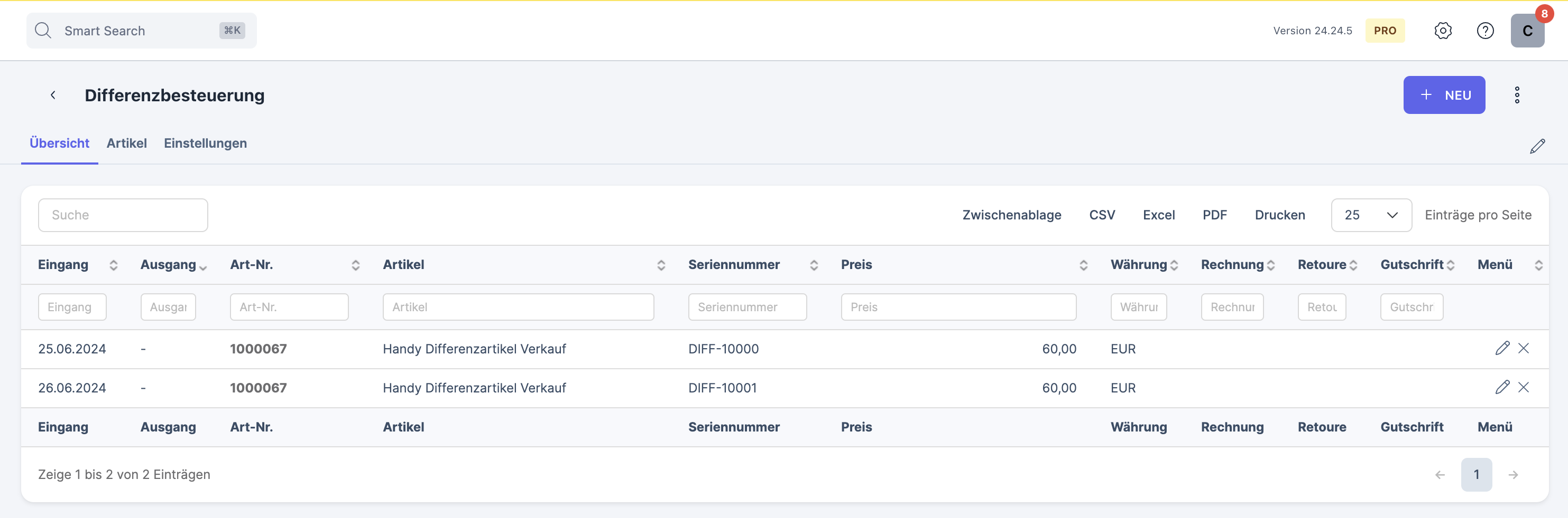 Der Artikel wird dir automatisch in der Übersicht der Funktion ‘ Differenzbesteuerung’ im Einkauf als Wareneingang angezeigt.