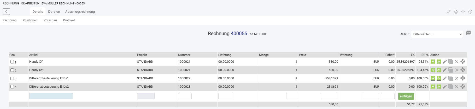 Unter der angegebenen Rechnungsnummer findest du im Modul Rechnung im Reiter Positionen die zur Differenzbesteuerung erstellten Artikelpositionen.