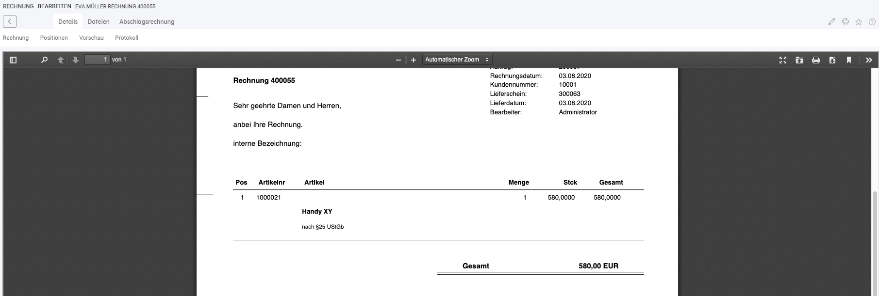 Der erste und zweite Eintrag heben sich gegenseitig auf, diese werden nur zur Erstellung des PDFs benötigt. Der dritte und vierte Eintrag sind die "Artikel für Differenz", wie sie in den Einstellungen beschrieben werden. Im Reiter Vorschau findest du die Rechnungsansicht des Kunden. Die Positionen 2, 3 und 4 werden hier ausgeblendet.