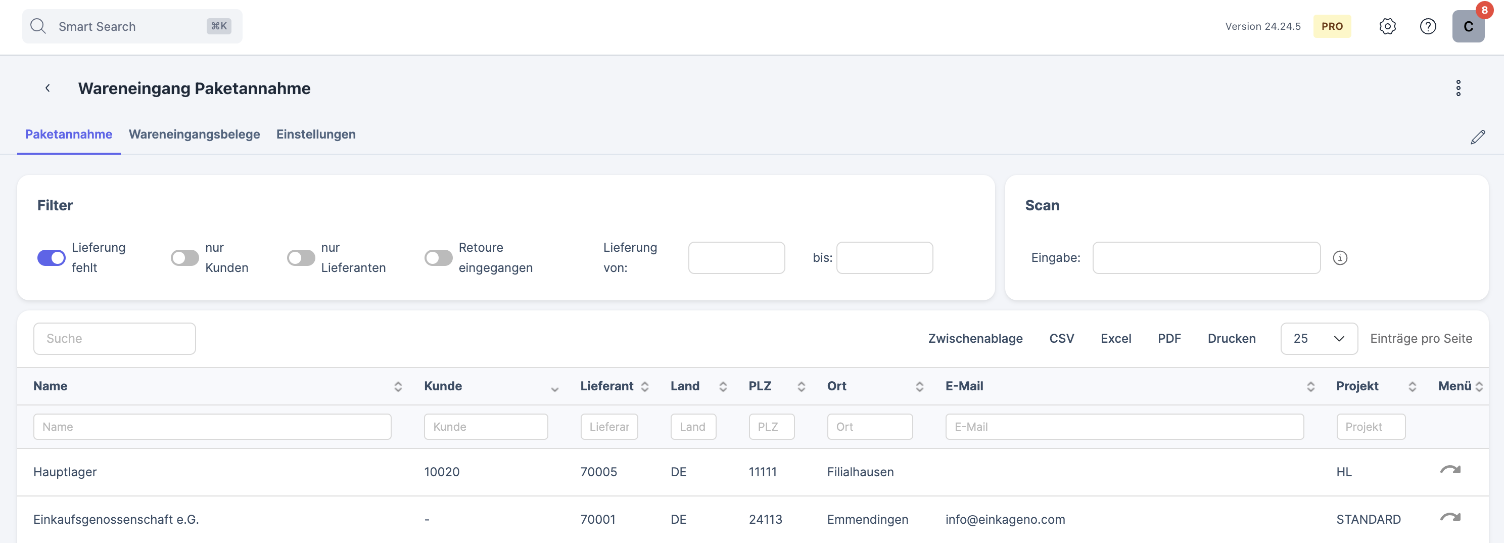 Klicke in den Lieferanten. Gehe auf den Reiter ‘Paketannahme’. Achtung: Wähle nicht die ‘Schnelle Paketannahme’, sie erfasst keine Seriennummern.