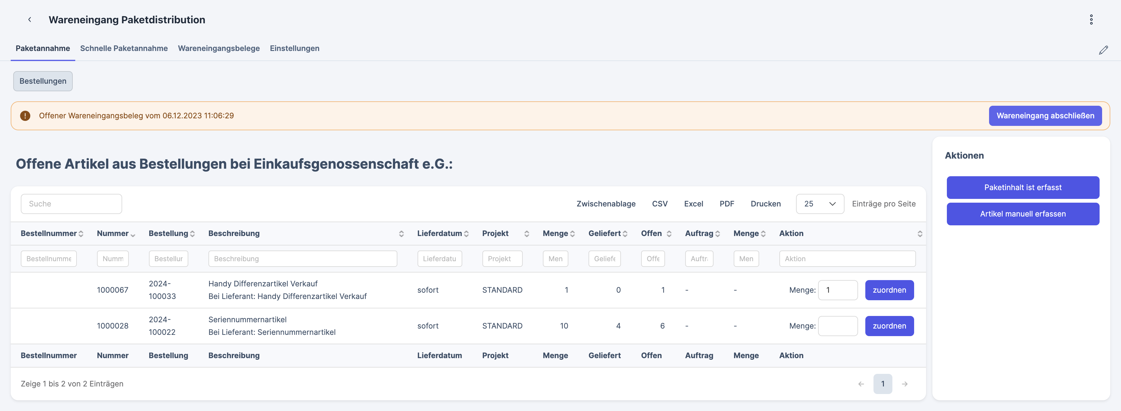 Der Prozess von Bestellung bis Wareneingang muss genau befolgt werden. Beachte dabei, dass die schnelle Warenannahme ungeeignet ist, da hierbei die Zuordnung der Seriennummer zum Lager nicht gewährleistet bleibt. Diese Zuordnung ist entscheidend für eine korrekte und lückenlose Buchhaltung.