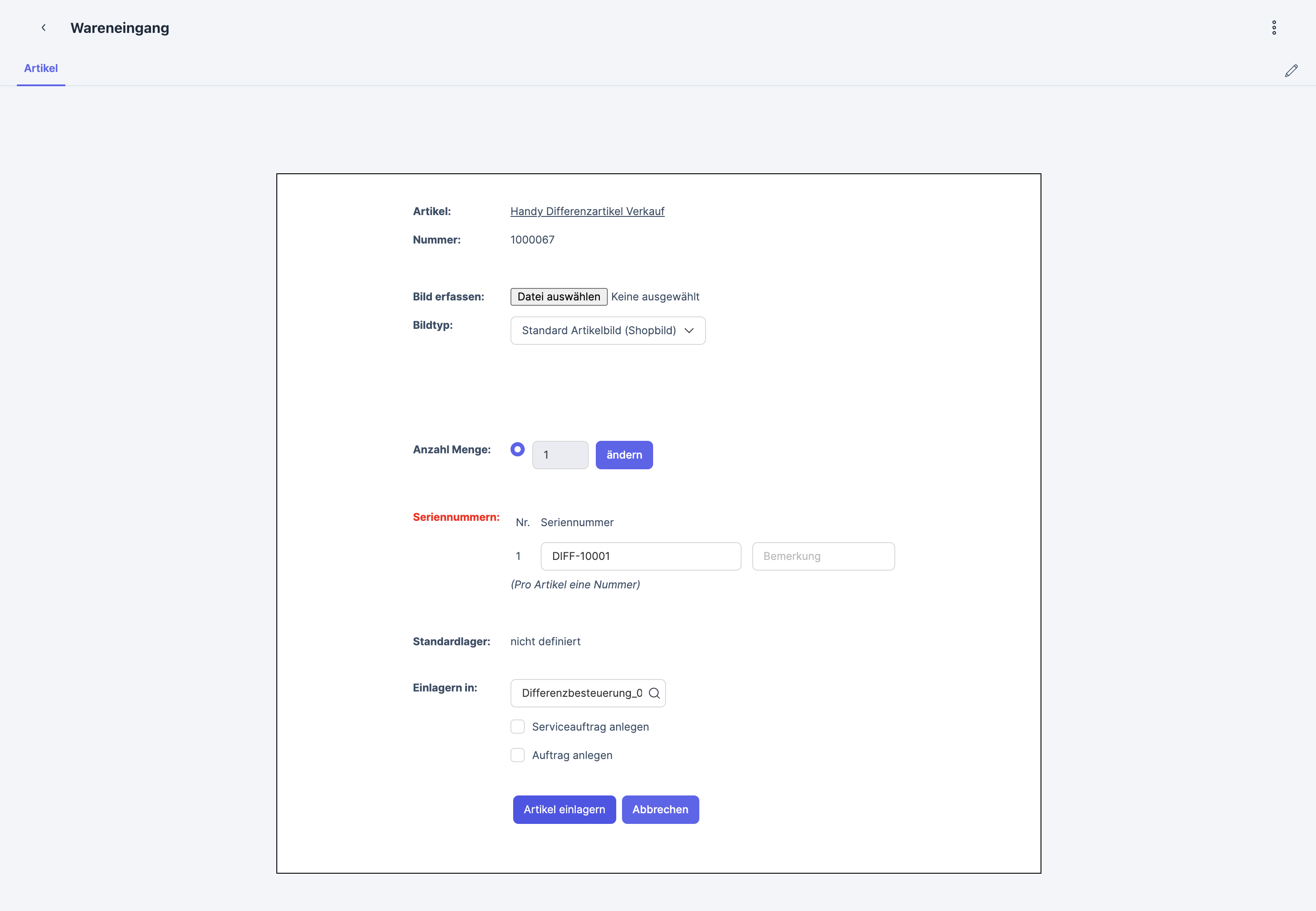 Eine vorherige Rechnungserstellung ohne Seriennummer ist nicht möglich. In diesem Fall wird der Artikel nicht differenzbesteuert.