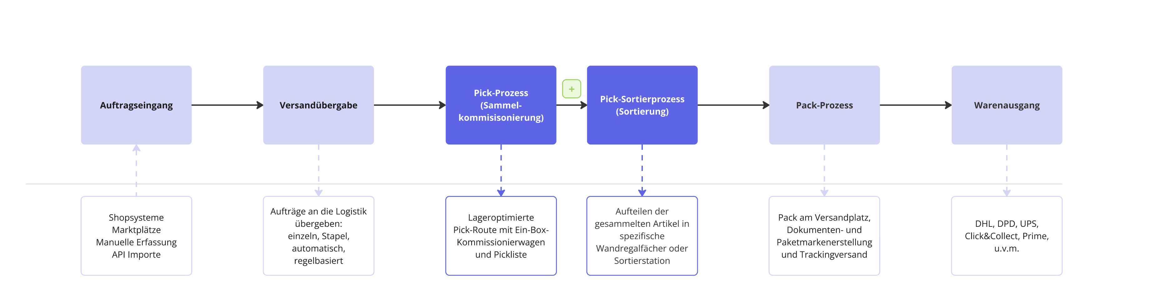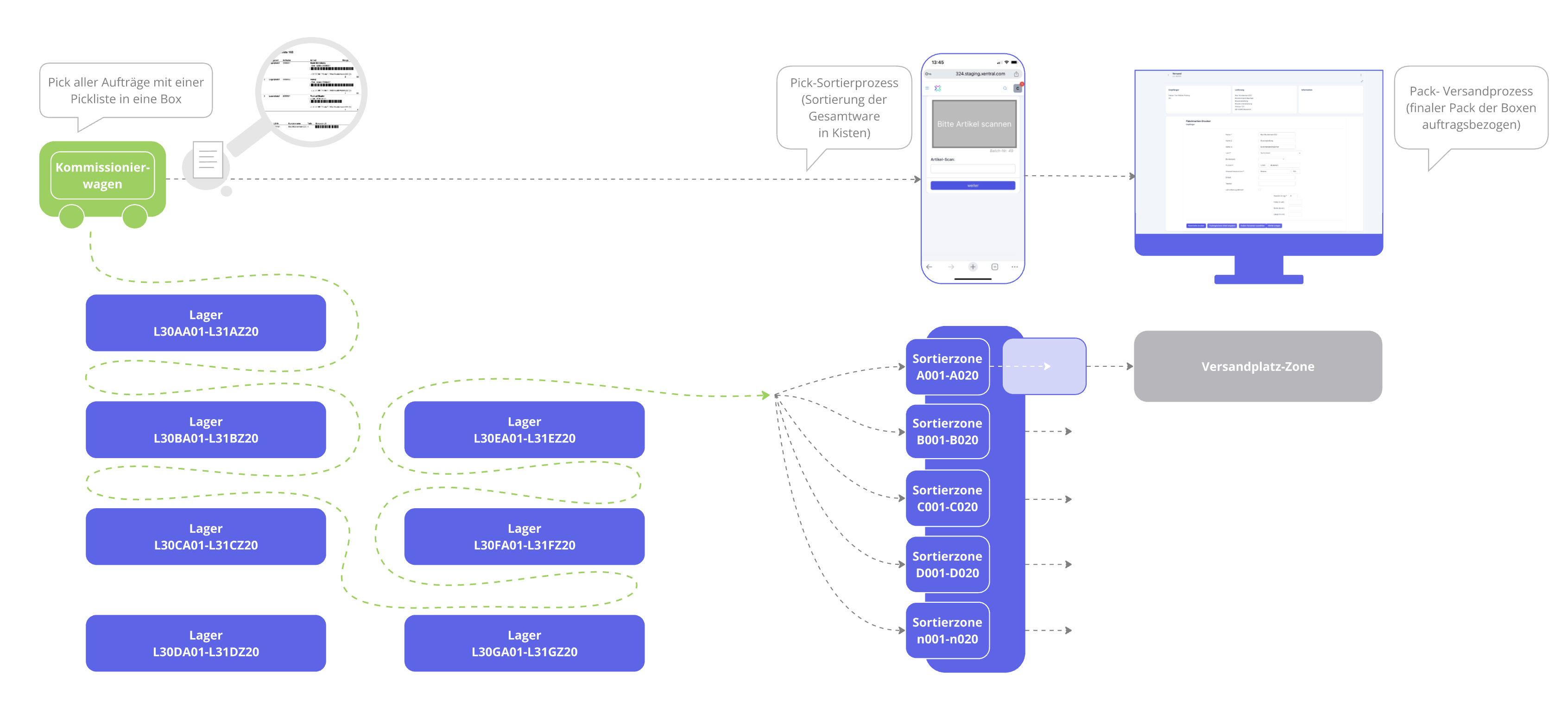 With the trolley you stand in front of a rack system with boxes, each of which can be identified by numbers and barcode. The items are taken from the cart and picked into a crate. Finished boxes are displayed and pushed out so that they can be shipped to the other side of the shipping center.