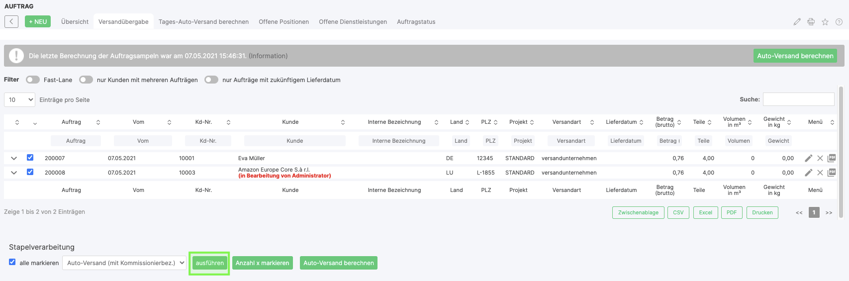 To do this, select the desired orders, choose the option Auto-shipment (with picking reference) and click on execute. This run is the basis for the Batch Picking app.