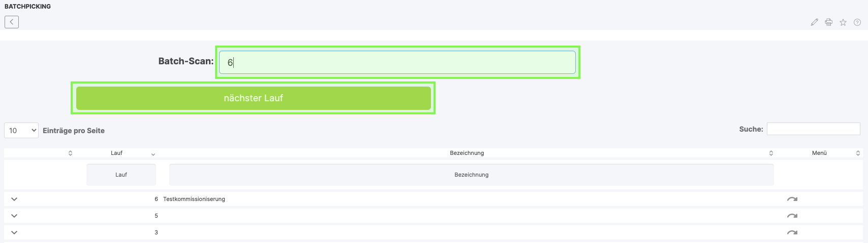 Next, navigate to the Batch Picking app. Here you select the desired run by entering the number into the field Batch-Scan (corresponds to the scan of the PDF) or by clicking on Next run.